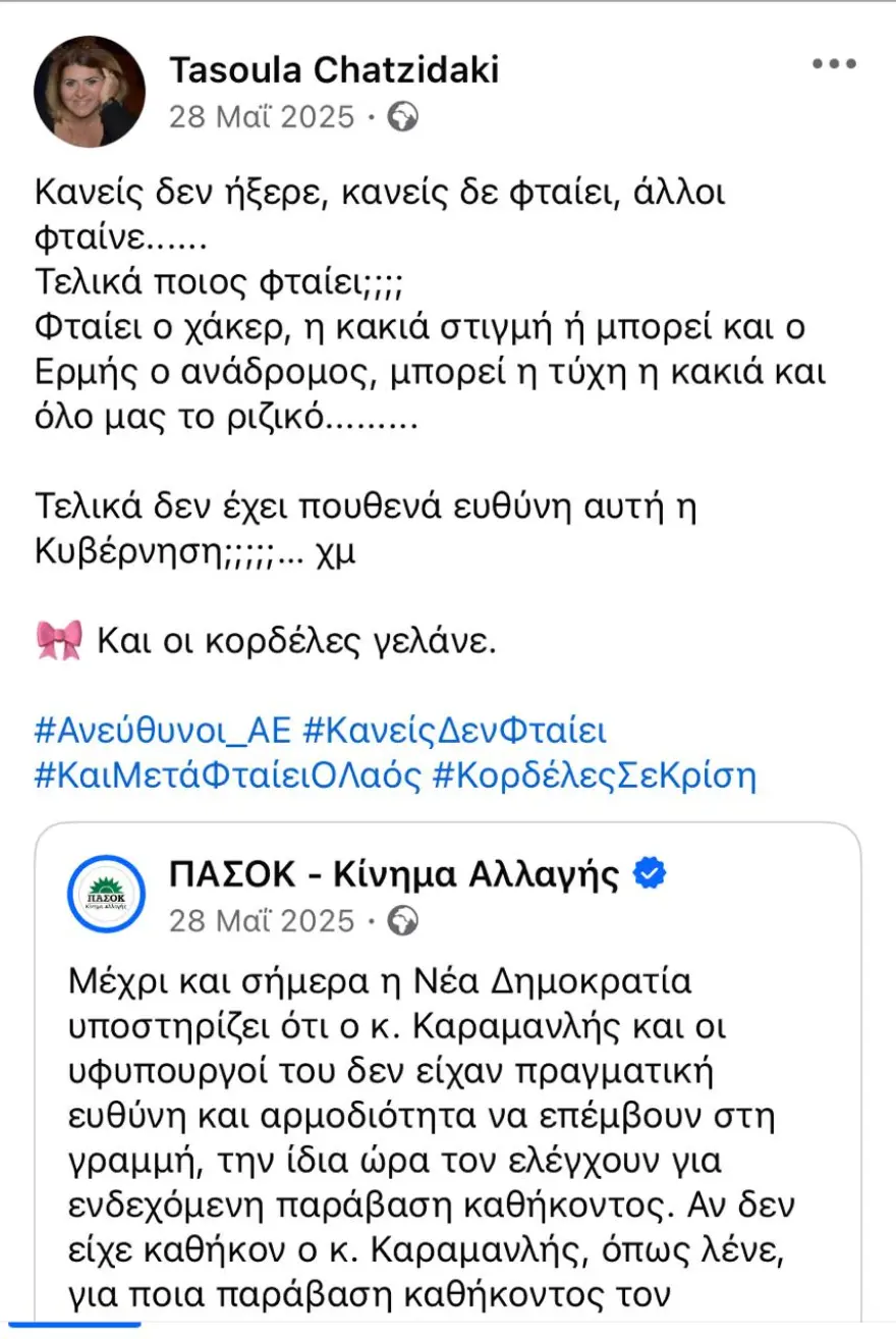 Στη Χαριλάου Τρικούπη επικρατεί στάση αναμονής. Ο Γραμματέας της ΚΠΕ Ανδρέας Σπυρόπουλος κίνησε τις διαδικασίες για την αναστολή της κομματικής ιδιότητας της κ. Χατζηδάκη μέχρι να ξεκαθαρίσει η υπόθεση. Ωστόσο, η συγκυρία δημιουργεί πολιτική πίεση, καθώς το ΠΑΣΟΚ έχει επενδύσει επικοινωνιακά στο αφήγημα της «πολιτικής αξιοπιστίας».