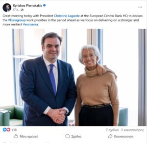 «Εξαιρετική» χαρακτηρίζει την σημερινή του συνάντηση με την Πρόεδρο της Ευρωπαϊκής Κεντρικής Τράπεζας (ΕΚΤ), Κριστίν Λαγκάρντ, ο υπουργός Εθνικής Οικονομίας και Οικονομικών, Κυριάκος Πιερρακάκης