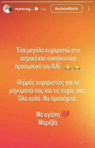 «Ένα μεγάλο ευχαριστώ στο ιατρικό και νοσηλευτικό προσωπικό του ΚΑΤ. Θερμές ευχαριστίες για τα μηνύματά σας και τις ευχές σας. Όλα καλά. Να προσέχετε. Με αγάπη. Μαρέβα» έγραψε: