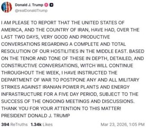 Συγκεκριμένα, ο Πρόεδρος των ΗΠΑ δήλωσε: «Με βάση το ύφος και τον τόνο αυτών των εις βάθος, λεπτομερών και εποικοδομητικών συνομιλιών, οι οποίες θα συνεχιστούν καθ’ όλη τη διάρκεια της εβδομάδας, έδωσα οδηγίες στο υπουργείο Πολέμου να αναβάλει κάθε είδους στρατιωτικά πλήγματα εναντίον ιρανικών εργοστασίων παραγωγής ενέργειας και ενεργειακών υποδομών για μια περίοδο πέντε ημερών, υπό την προϋπόθεση της επιτυχίας των συνεχιζόμενων συναντήσεων και συζητήσεων».