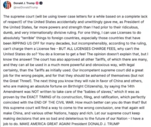 «Το ανώτατο δικαστήριο (θα χρησιμοποιήσω πεζά τώρα, ελλείψει κάθε σεβασμού!) των Ηνωμένων Πολιτειών μου έδωσε κατά τύχη και ασυνειδήτως, εμένα, του Προέδρου των Ηνωμένων Πολιτειών, πολύ περισσότερες εξουσίες και δύναμη απ’ αυτές που είχα πριν τη γελοία, ηλίθια και πολύ πολωτική σε διεθνές επίπεδο απόφασή τους», έγραψε καταγγέλλοντας την απόφαση του δικαστηρίου να περικόψει μεγάλο μέρος των δικαιωμάτων του επί της δασμολογικής πολιτικής.
