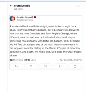 «Ένας ολόκληρος πολιτισμός θα χαθεί απόψε, για να μην ξαναγυρίσει ποτέ», ανέφερε χαρακτηριστικά στην νέα του ανάρτησή στην πλατφόρμα Truth Social.