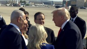 Τον Πρόεδρο των ΗΠΑ υποδέχθηκαν στο αεροδρόμιο ο Πρωθυπουργός του Ισραήλ, Μπενιαμίν Νετανιάχου και ο Πρόεδρος της χώρας, Ισαάκ Χέρτζογκ. Η τελευταία φορά που το προεδρικό αεροσκάφος Air Force One επισκέφτηκε το Ισραήλ ήταν αμέσως μετά τις επιθέσεις της 7ης Οκτωβρίου 2023, όταν ο τότε Πρόεδρος Τζο Μπάιντεν έφτασε για μια επίσκεψη αλληλεγγύης.