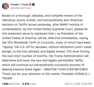 «Με βάση μια διεξοδική, λεπτομερή και πλήρη ανασκόπηση της γελοίας, κακογραμμένης και εξαιρετικά αντιαμερικανικής απόφασης σχετικά με τους δασμούς που εκδόθηκε χθες, μετά από πολλούς μήνες σκέψης, από το Ανώτατο Δικαστήριο των ΗΠΑ, παρακαλώ να θεωρηθεί η παρούσα δήλωση ως δήλωση ότι εγώ, ως Πρόεδρος των Ηνωμένων Πολιτειών της Αμερικής, θα αυξήσω, με άμεση ισχύ, τον παγκόσμιο δασμό 10% σε χώρες, πολλές από τις οποίες “εκμεταλλεύονταν” τις Ηνωμένες Πολιτείες για δεκαετίες, χωρίς αντίποινα (μέχρι που ήρθα εγώ!), στο πλήρως επιτρεπόμενο και νομικά ελεγμένο επίπεδο του 15%», έγραψε ο Τραμπ στο Truth Social.