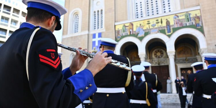 Οι καμπάνες της Μητρόπολης χτύπησαν πένθιμα, ενώ η Μπάντα του Πολεμικού Ναυτικού παιάνιζε γνωστά εμβατήρια και τρεις εμβληματικές μελωδίες του συνθέτη — το λυρικό «Λαύριο», τη θρυλική «Συννεφούλα» και την «Ωδή στον Γεώργιο Καραϊσκάκη» — σε μια συμβολική ένδειξη τιμής προς τον καλλιτέχνη που έντυσε με μουσική τη μεταπολιτευτική ψυχή της χώρας.