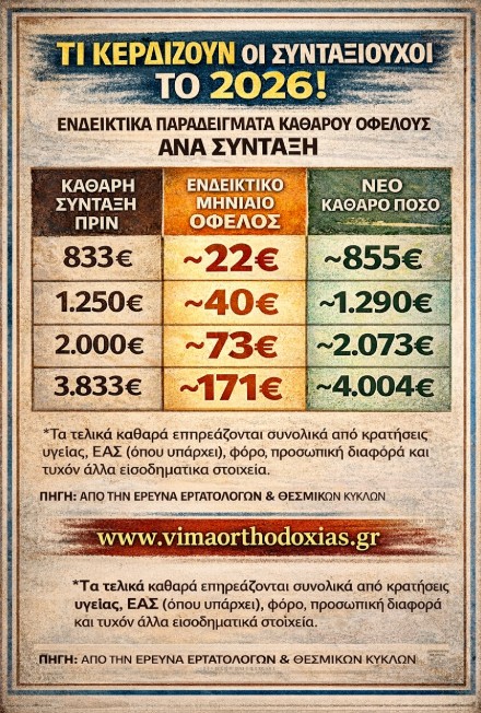 Παράλληλα με την αύξηση, πολλοί είδαν μικρότερη μηνιαία παρακράτηση φόρου, κάτι που ανεβάζει το καθαρό ποσό. Αυτό δεν αφορά όλους στον ίδιο βαθμό (εξαρτάται από εισοδήματα, αφορολόγητο, κλίμακα και παρακρατήσεις), όμως στις συντάξεις πάνω από ένα επίπεδο, η διαφορά είναι υπαρκτή.