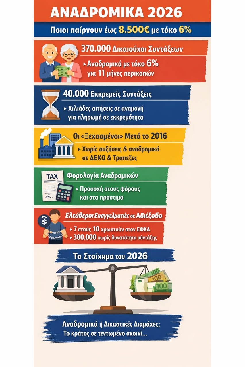ΣΥΝΤΑΞΕΙΣ ΑΝΑΔΡΟΜΙΚΑ 2026: Ποιοι δικαιούνται έως €8.500, τόκος 6% και 370.000 πληρωμές
