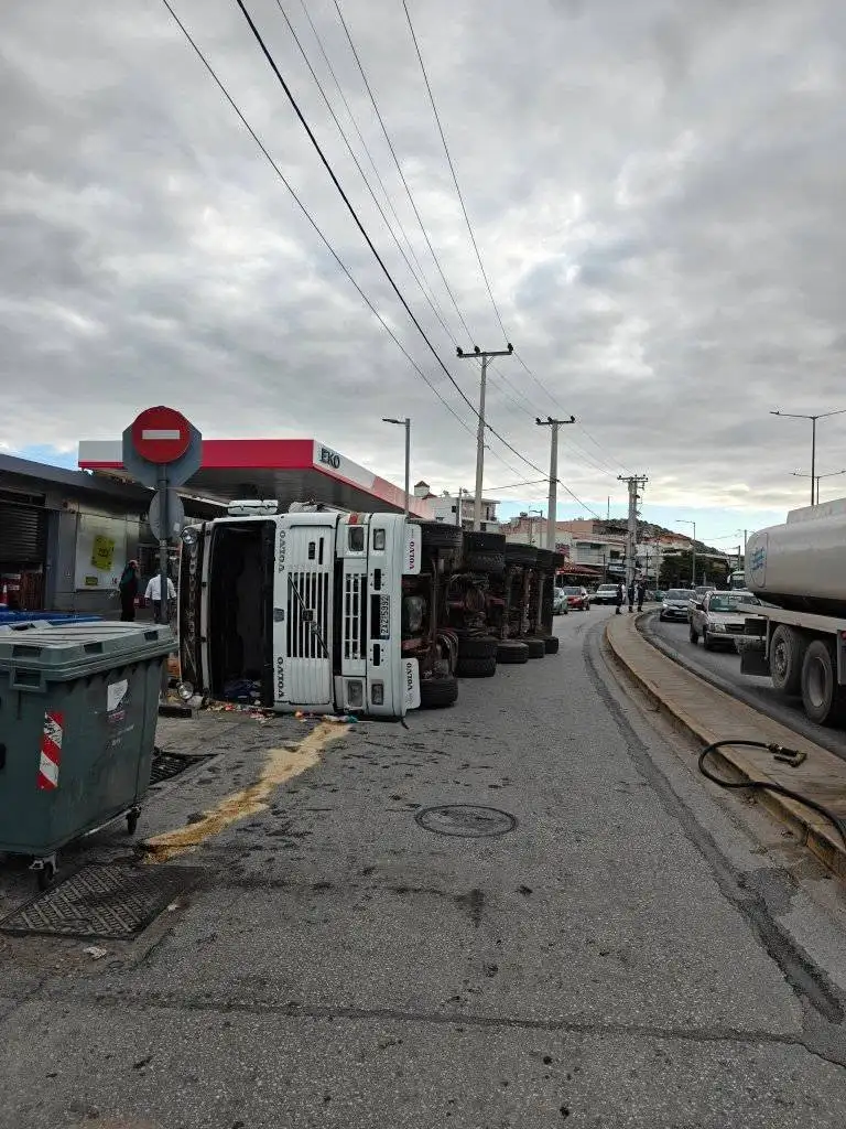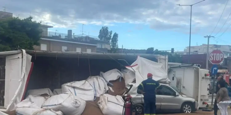 Σύμφωνα με τις πρώτες πληροφορίες, μια νταλίκα που μετέφερε σακιά με χώμα ανετράπη κάτω από αδιευκρίνιστες συνθήκες, καταλήγοντας πάνω σε σταθμευμένο όχημα έξω από πρατήριο καυσίμων.