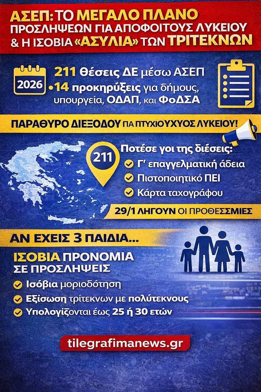 Την ίδια ώρα που οι προκηρύξεις «τρέχουν», μια νομοθετική παρέμβαση του Υπουργείου Εσωτερικώναλλάζει τα δεδομένα για 1,2 εκατομμύρια πολίτες. Η νέα διάταξη που κατατέθηκε στη Βουλή μετατρέπει την τριτεκνική ιδιότητα σε ισόβια.