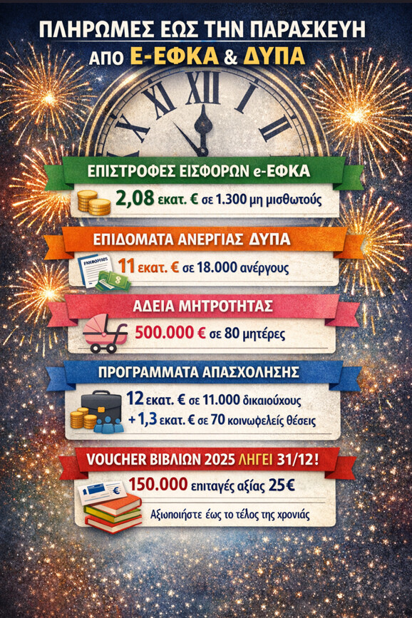 Την ίδια στιγμή, «τρέχει» αντίστροφα ο χρόνος για το πρόγραμμα επιταγών αγοράς βιβλίων 2025 της ΔΥΠΑ. Η προθεσμία λήγει στις 31 Δεκεμβρίου και αφορά 150.000 επιταγές αξίας 25 ευρώ η καθεμία, με συνολικό προϋπολογισμό 3,75 εκατ. ευρώ.