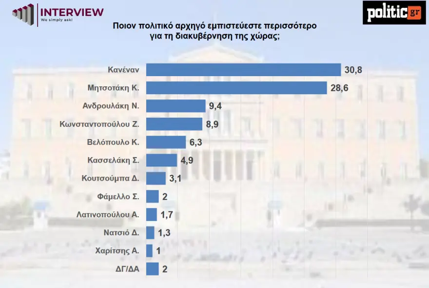 Στο ερώτημα για τον πολιτικό αρχηγό που εμπιστεύονται περισσότερο για τη διακυβέρνηση της χώρας, πρώτος κατατάσσεται ο Κυριάκος Μητσοτάκης με 28,6%. Ακολουθούν ο Νίκος Ανδρουλάκης με 9,4%, η Ζωή Κωνσταντοπούλου με 8,9%, ο Κυριάκος Βελόπουλος με 6,3%, ο Στέφανος Κασσελάκης με 4,9%, ο Δημήτρης Κουτσούμπας με 3,1% και ο Σωκράτης Φάμμελος με 2%.
