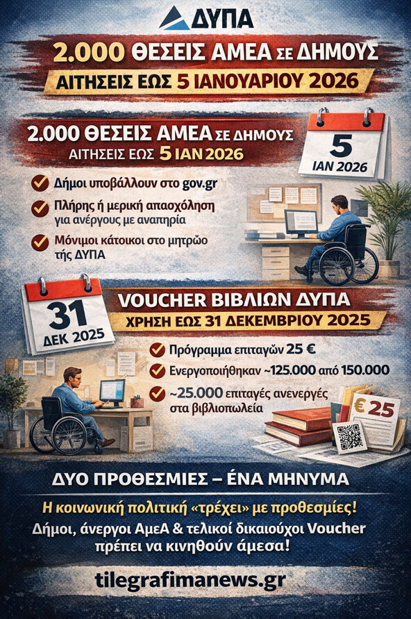 ΔΥΠΑ: Η ΔΥΠΑ κλείνει το 2025 με δύο παράλληλες δράσεις κοινωνικής πολιτικής που τρέχουν ταυτόχρονακαι απαιτούν άμεση κινητοποίηση: από τη μία, το Ειδικό Πρόγραμμα Απασχόλησης 2.000 ανέργων ΑμεΑ σε Δήμους, με προθεσμία αιτήσεων για τους ΟΤΑ έως τις 5 Ιανουαρίου 2026 μέσω της πλατφόρμας gov.gr, και από την άλλη, τη λήξη του Voucher βιβλίων ΔΥΠΑ στις 31 Δεκεμβρίου 2025, με δεκάδες χιλιάδες επιταγές να παραμένουν ακόμη ανενεργές.