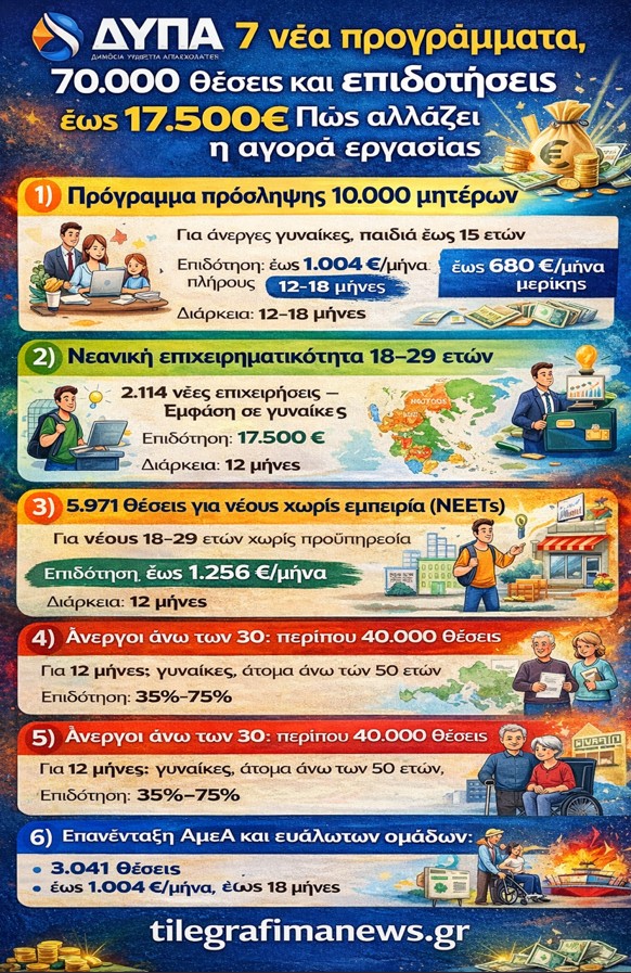 ΔΥΠΑ: Με ένα εκτεταμένο πλέγμα παρεμβάσεων, η ΔΥΠΑ περνά το 2026 σε φάση επιθετικής πολιτικής απασχόλησης, ενεργοποιώντας επτά νέα προγράμματα που αφορούν συνολικά 70.000 ανέργους σε όλη τη χώρα.