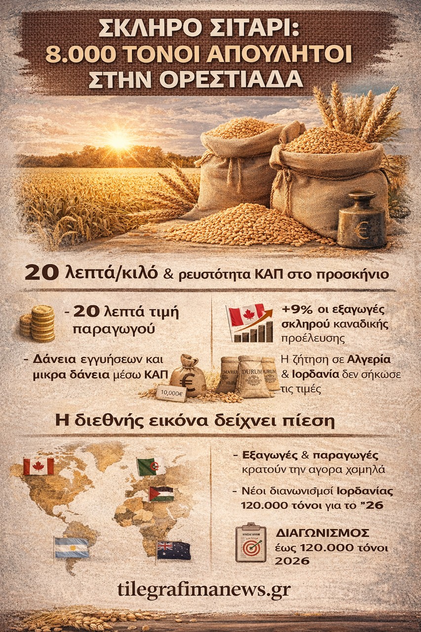 ΑΓΡΟΤΙΚΑ ΝΕΑ: Στασιμότητα και έντονη ανησυχία επικρατούν στην αγορά σκληρού σιταριού στην Ορεστιάδα, όπου περίπου 8.000 τόνοι της σοδειάς του 2025 παραμένουν απούλητοι στα χέρια των παραγωγών, την ώρα που οι τιμές δείχνουν να «κλειδώνουν» γύρω στα 20 λεπτά το κιλό.