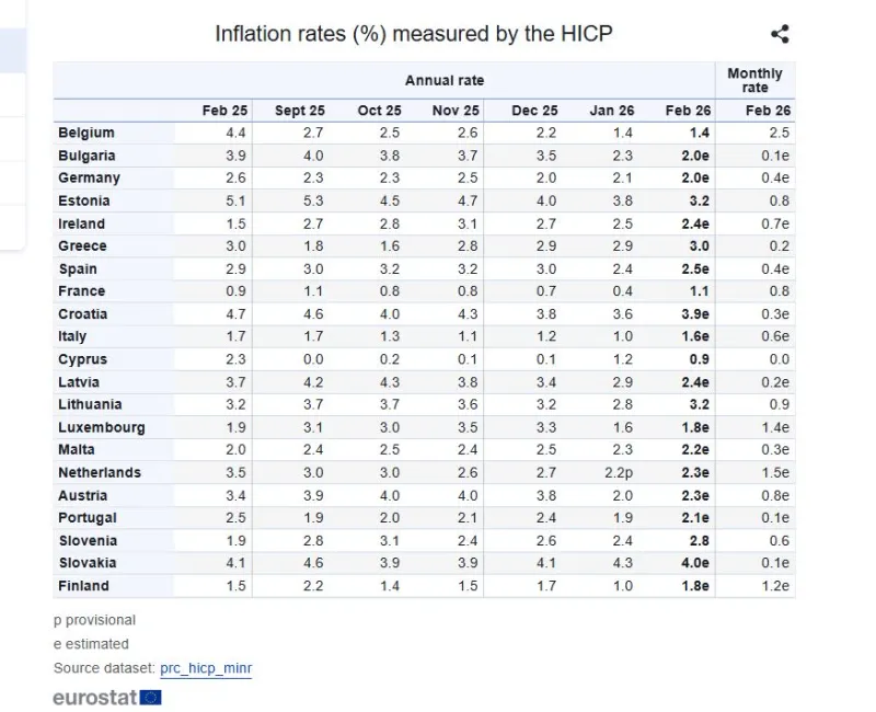 Eurostat: Στο 3% ανήλθε ο πληθωρισμός στην Ελλάδα τον Φεβρουάριο από 2,9% τον Ιανουάριο, σύμφωνα με τα προκαταρκτικά στοιχεία της Eurostat.