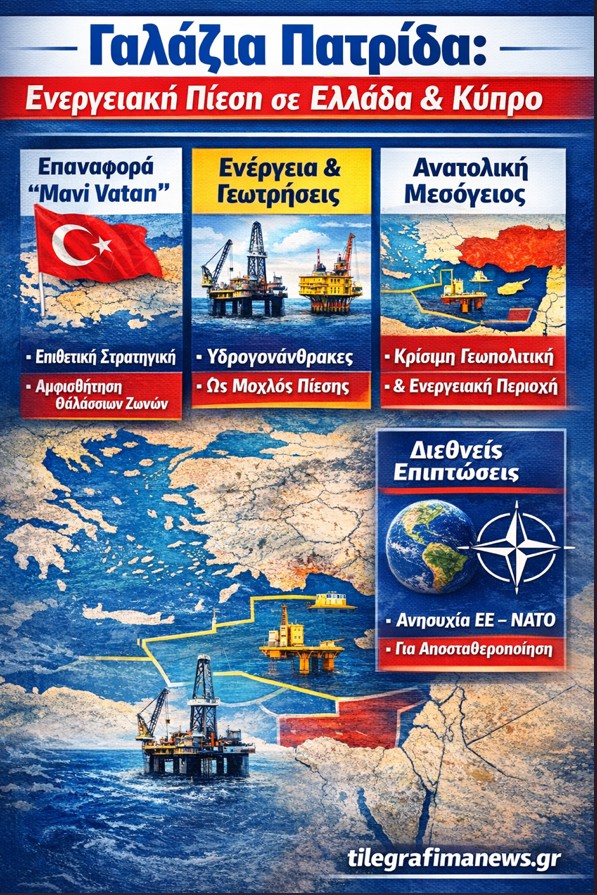 Γαλάζια Πατρίδα: Η Τουρκία επαναφέρει με ένταση το δόγμα της «Γαλάζιας Πατρίδας», επιλέγοντας να ασκήσει πίεση σε Ελλάδα και Κύπρο μέσα από έναν συνδυασμό ενεργειακής στρατηγικής, διπλωματικών κινήσεων και μονομερών χαρτογραφήσεων, σε πλήρη αντίθεση με τις αρχές του διεθνούς δικαίου όπως αυτές κατοχυρώνονται από τον Οργανισμό Ηνωμένων Εθνών.