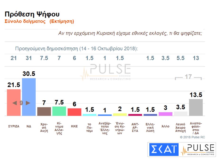 Και η δημοσκόπηση της Pulse δείχνει την παγιωμένη διαφορά ΝΔ – ΣΥΡΙΖΑ. Το προβάδισμα της έναντι του ΣΥΡΙΖΑ διατηρεί η Νέα Δημοκρατία, σύμφωνα με τη δημοσκόπηση της Pulse, που διενεργήθηκε το διάστημα 18 έως 20 Νοεμβρίου, για λογαριασμό του ΣΚΑΪ.