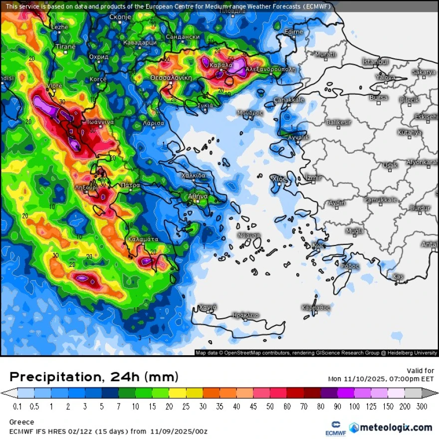 Σύμφωνα με στοιχεία του Εθνικού Αστεροσκοπείου Αθηνών – meteo.gr, οι βροχές του διημέρου ενδέχεται να ξεπεράσουν τα 80 χιλιοστά τοπικά, επίπεδα που καταγράφονται συνήθως σε «μεσογειακού τύπου» καταιγίδες μεγάλης διάρκειας.