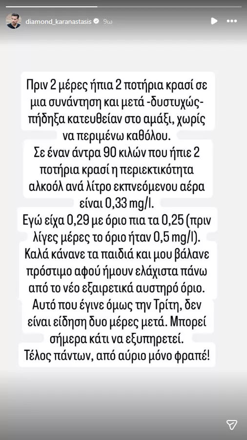 Ο ηθοποιός και σύντροφος της Ζωής Κωνσταντοπούλου μέσω Instagram story αναφέρθηκε στο περιστατικό και εξήγησε τι συνέβη. Όπως αναφέρει: «Πριν 2 μέρες ήπια 2 ποτήρια κρασί σε μια συνάντηση και μετά –δυστυχώς– πήδηξα κατευθείαν στο αμάξι, χωρίς να περιμένω καθόλου». «Aπό αύριο μόνο φραπέ!», τόνισε.