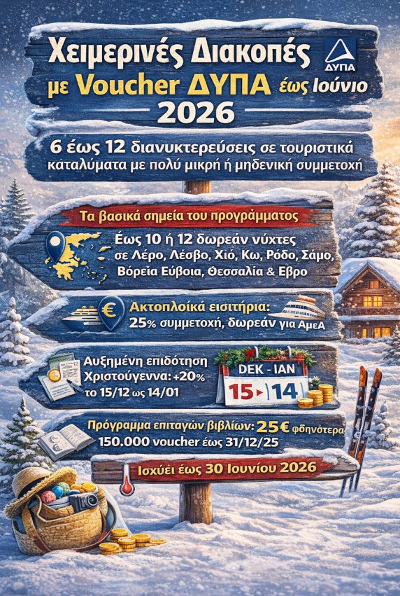 ΔΥΠΑ: Με ΔΥΠΑ στο επίκεντρο του κοινωνικού της ρόλου, χιλιάδες δικαιούχοι μπορούν και φέτος να σχεδιάσουν χειμερινές διακοπές με σημαντική επιδότηση, αξιοποιώντας τα voucher κοινωνικού τουρισμού που παραμένουν ενεργά έως και 30 Ιουνίου 2026.