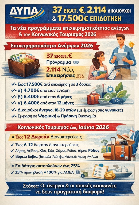 ΔΥΠΑ: Με διπλό πακέτο παρεμβάσεων ξεκινά το 2026 για χιλιάδες νέους ανέργους και δικαιούχους κοινωνικών παροχών, καθώς η ΔΥΠΑ ενεργοποιεί νέο πρόγραμμα επιχειρηματικότητας 37 εκατ. ευρώ για ηλικίες 18–29 ετών, ενώ παράλληλα «τρέχει» ο Κοινωνικός Τουρισμός με δωρεάν διανυκτερεύσεις έως και 12 νύχτες και επιδότηση ακτοπλοϊκών.