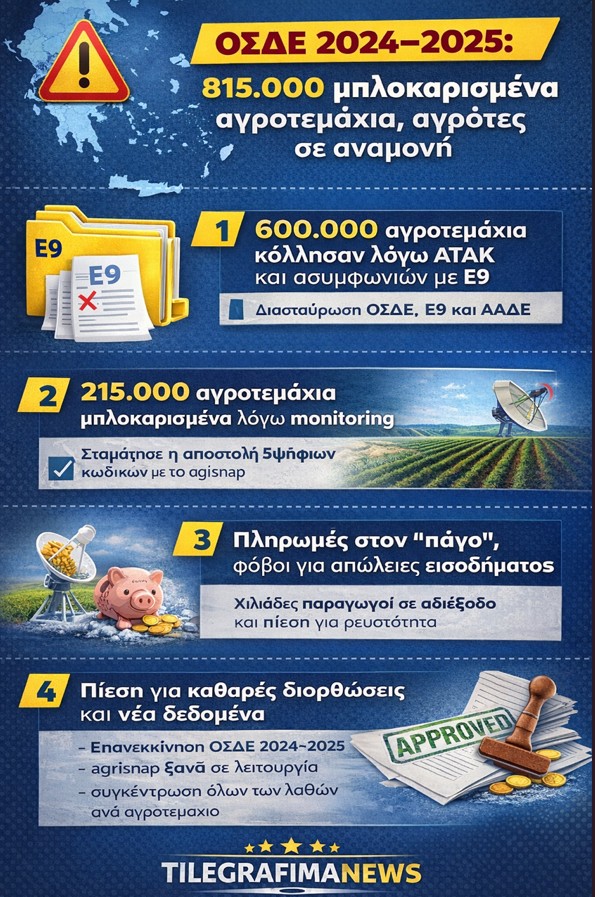 ΟΠΕΚΕΠΕ: Σε παρατεταμένη θεσμική ομηρία βρίσκονται χιλιάδες αγρότες σε όλη τη χώρα, καθώς το άνοιγμα του ΟΣΔΕ 2024 και 2025 για διορθώσεις παραμένει σε εκκρεμότητα, με αποτέλεσμα πάνω από 815.000 αγροτεμάχια να εμφανίζονται μπλοκαρισμένα ή μηδενισμένα στις πληρωμές.