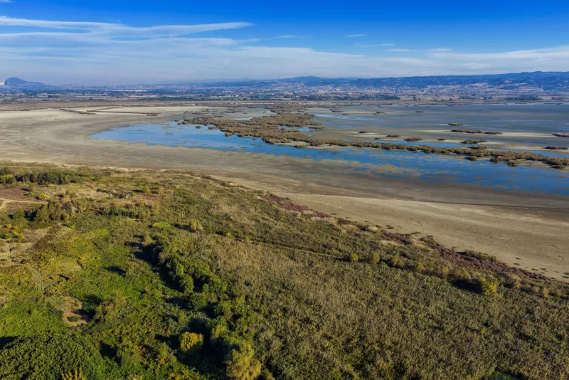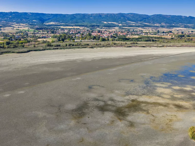 Σχεδόν η μισή έχει μείνει η Λίμνη Κορώνεια, ή λίμνη Αγίου Βασιλείου (από το ομώνυμο χωριό), στον Λαγκαδά της Θεσσαλονίκης, λόγω της παρατεταμένης ανομβρίας.
