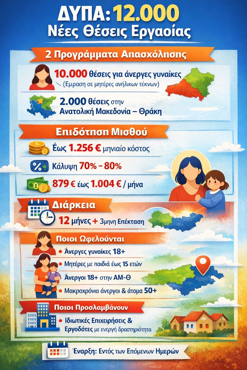 ΔΥΠΑ: Με δύο στοχευμένες παρεμβάσεις που «κουμπώνουν» πάνω στις ανάγκες της αγοράς εργασίας, η ΔΥΠΑ προχωρά στην ενεργοποίηση νέων προγραμμάτων απασχόλησης για 12.000 ανέργους, με ξεκάθαρη έμφαση αφενός στις γυναίκες (10.000 θέσεις) και αφετέρου στην Περιφέρεια Ανατολικής Μακεδονίας – Θράκης (2.000 θέσεις).