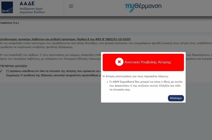 Από χθες και μέχρι αυτή τη στιγμή, το myΘέρμανση εμφανίζει την ίδια ακριβώς δυσλειτουργία σε μεγάλο αριθμό αιτήσεων. Σύμφωνα με τεχνικούς που συνεργάζονται με το Υπουργείο Οικονομικών, το σφάλμα συνδέεται με τον τρόπο που το σύστημα «τραβάει» τα στοιχεία εκμισθωτή – ιδιοκτήτη – παραχωρητή, ειδικά σε περιπτώσεις όπου: