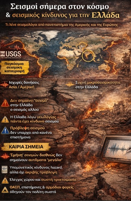 Οι σεισμοί στον κόσμο σήμερα επιβεβαιώνουν κάτι απλό: ζούμε σε έναν ενεργό πλανήτη. Η Ελλάδα, λόγω θέσης, θα συνεχίσει να δέχεται δονήσεις – και ναι, κάποτε θα υπάρξει και ισχυρός σεισμός, όπως έχει υπάρξει ιστορικά. Αυτό όμως δεν σημαίνει ότι «έρχεται αύριο» ή ότι μπορεί κάποιος σοβαρός επιστήμονας να δώσει ημερομηνία. Το μόνο σοβαρό στοίχημα είναι η πρόληψη, οι έλεγχοι, η ενημέρωση και η ψυχραιμία.