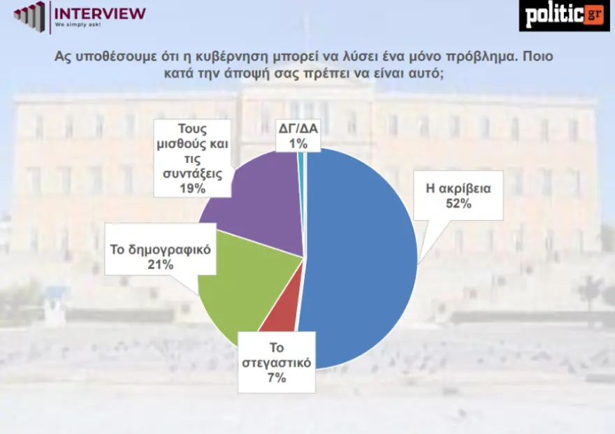 Στη σημαντικότερη ερώτηση της δημοσκόπησης — ποιο πρόβλημα πρέπει να λύσει πρώτο η κυβέρνηση — οι πολίτες απάντησαν: