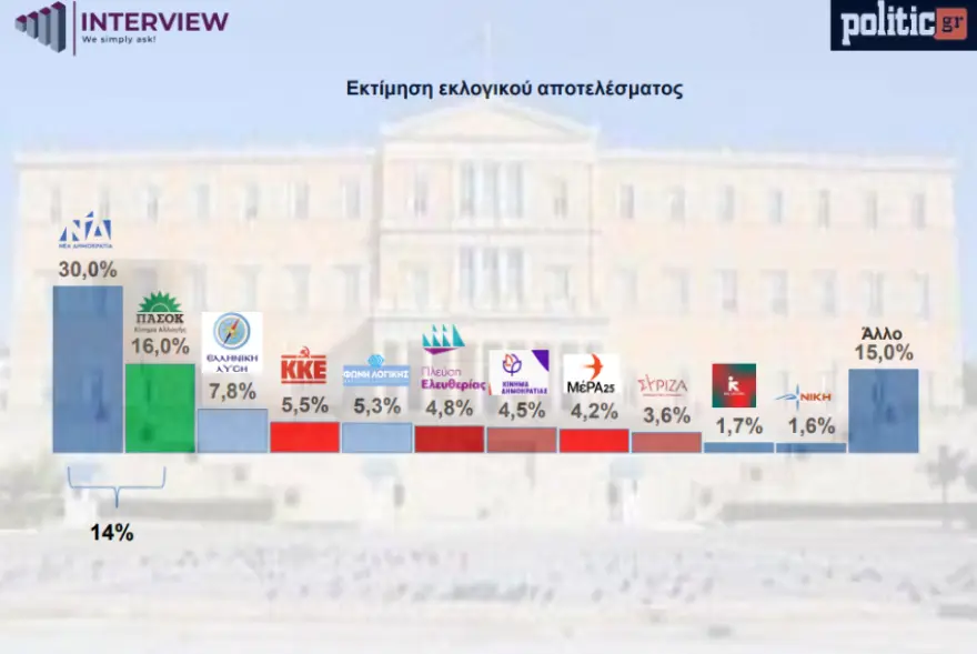 Η δημοσκόπηση δείχνει τη Νέα Δημοκρατία στο 30%, με το ΠΑΣΟΚ να ακολουθεί στο 16% και την Ελληνική Λύση στο 7,8%. Τα υπόλοιπα κόμματα κινούνται ως εξής: