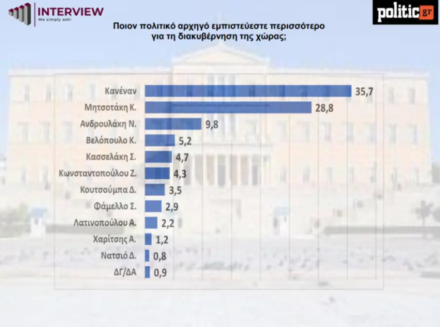 Στο ερώτημα «ποιον εμπιστεύεστε περισσότερο για τη διακυβέρνηση της χώρας;» ο Κυριάκος Μητσοτάκης παραμένει κυρίαρχος με 28,8%, με τον Νίκο Ανδρουλάκη να ακολουθεί με 9,8%.