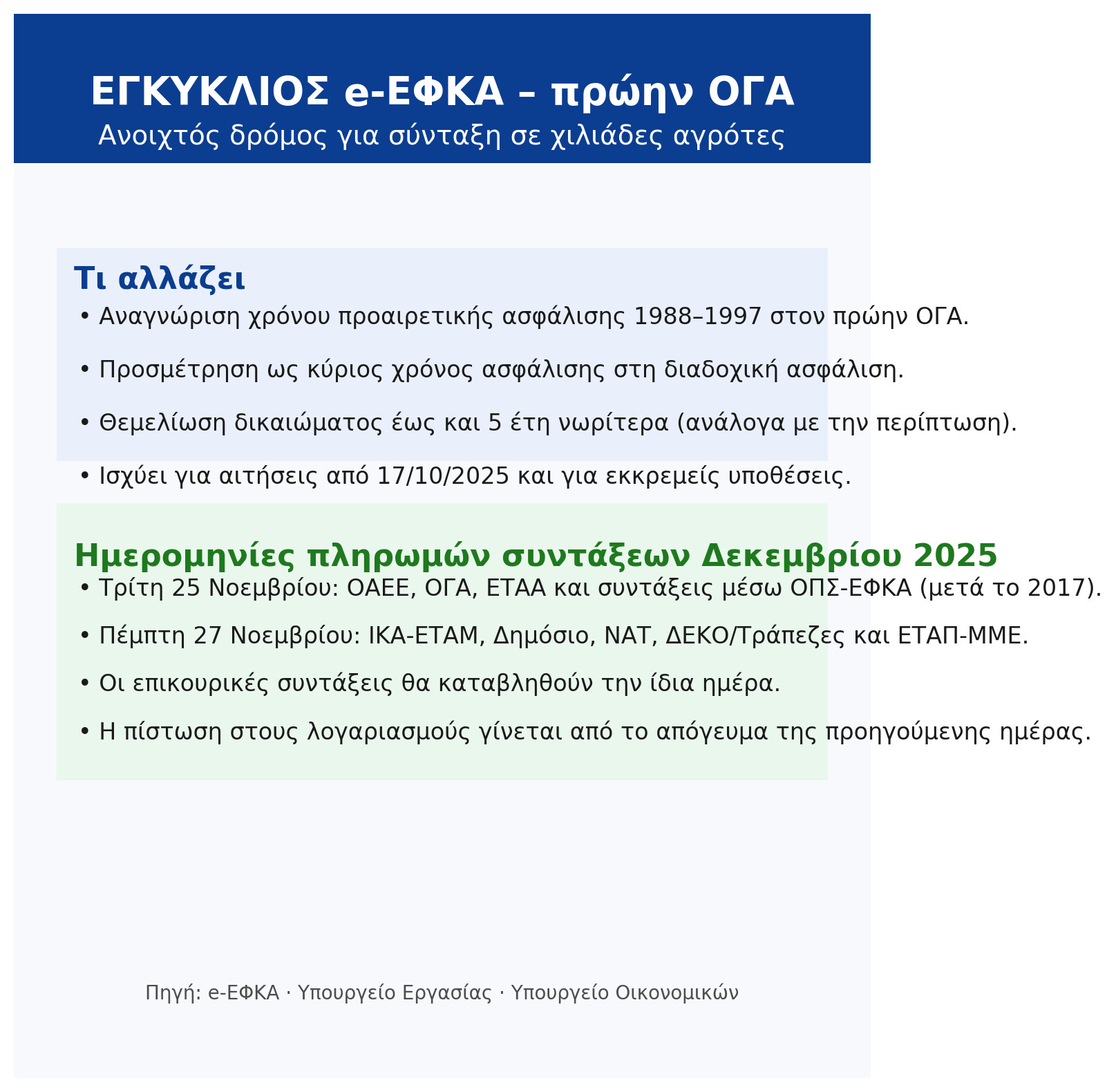 ΣΥΝΤΑΞΕΙΣ: Η νέα εγκύκλιος του e-ΕΦΚΑ ανοίγει τον δρόμο για πρόωρη συνταξιοδότηση έως και πέντε χρόνια νωρίτερα σε δεκάδες χιλιάδες ασφαλισμένους του πρώην ΟΓΑ, που πλέον αποκτούν τη δυνατότητα αναγνώρισης του χρόνου προαιρετικής ασφάλισης της περιόδου 1988–1997.