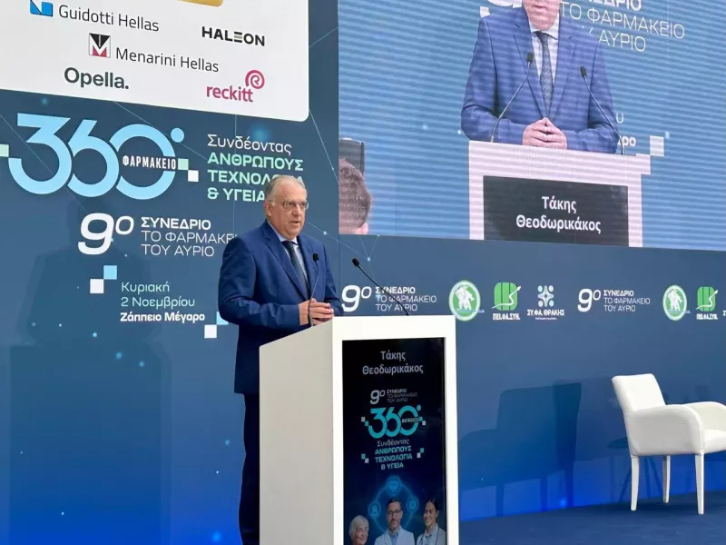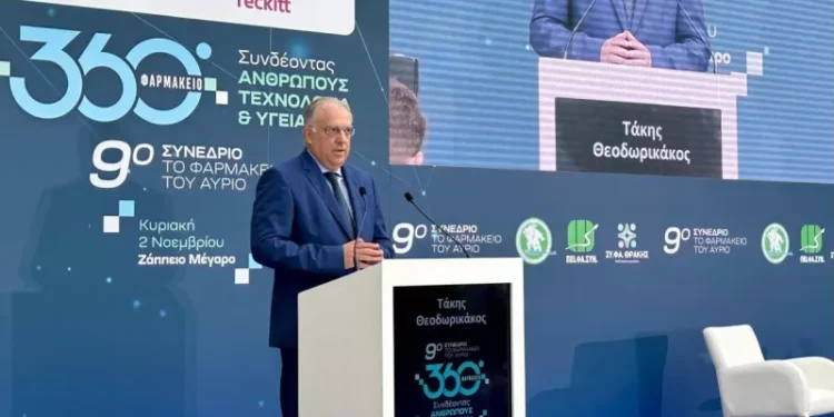 Θεοδωρικάκος: «Οι φαρμακοποιοί αποτελούν έναν από τους πιο σταθερούς και ουσιαστικούς πυλώνες ανάπτυξης της ελληνικής οικονομίας και του συστήματος υγείας», τόνισε ο Υπουργός Ανάπτυξης, Τάκης Θεοδωρικάκος, στο 9ο Συνέδριο του Πειραϊκού Φαρμακευτικού Συνεταρισμού (ΠΕΙ.ΦΑ.ΣΥΝ.) με θέμα «Φαρμακείο 360: Συνδέοντας ανθρώπους, τεχνολογία και υγεία» στο Ζάππειο Μέγαρο.