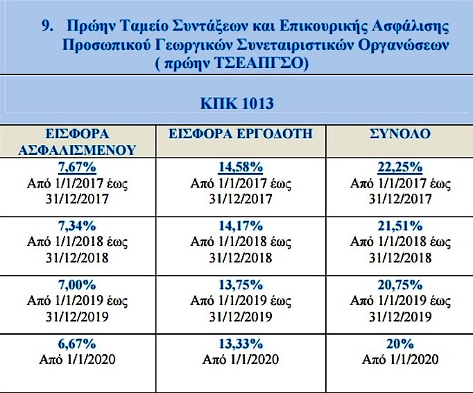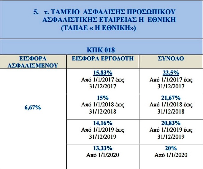 Επιπλέον, προβλέπεται ότι τυχόν υψηλότερα ή χαμηλότερα των οριζομένων, ως ανωτέρω, ποσοστών ασφαλιστικών εισφορών κλάδου κύριας σύνταξης αναπροσαρμόζονται, ετησίως, ισόποσα και σταδιακά, από 01/01/2017 και εφεξής, ώστε από 01/01/2020 να διαμορφωθούν, ως εξής: 13,33% για τον εργοδότη και 6,67% για τον ασφαλισμένο.