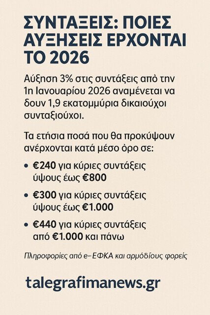Το 2026 φέρνει την αύξηση 2,4% τόσο στην εθνική όσο και στην ανταποδοτική σύνταξη – αύξηση που μπαίνει αυτόματα σε όσους έχουν χαρακτηριστεί συνταξιούχοι έως 30 Νοεμβρίου 2025. Με απλά λόγια: